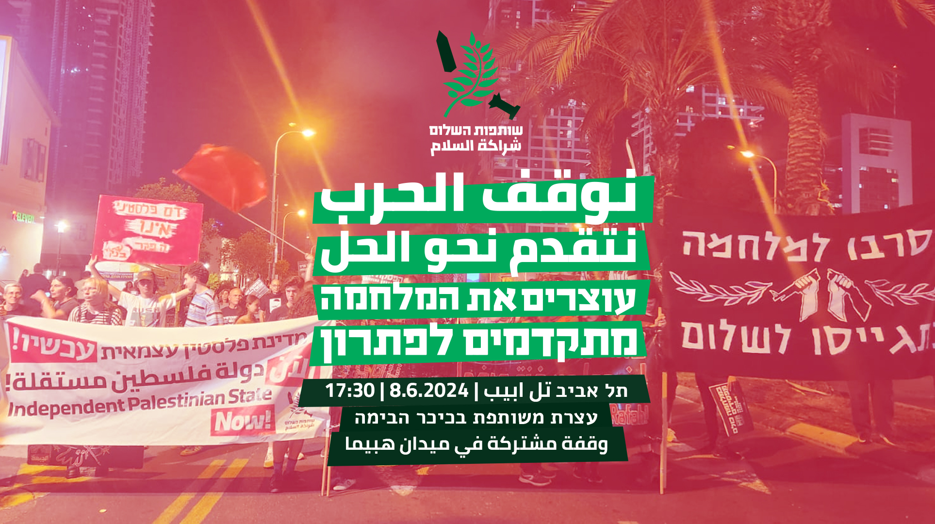 ב-8.6, אירגוני השלום בארץ בהובלת שותפות השלום יקיימו הפגנה ארצית ערבית-יהודית בת”א בקריאה לסיום 57 שנים לכיבוש הישראלי הצבאי שמונע מהעם הפלסטיני את הזכות להגדרה עצמית ובכך פוגע בשלום ובביטחון של הפלסטינים והישראלים וכל העמים באזורفي 8 حزيران/يونيو، ستنظم منظمات السلام في إسرائيل بقيادة شراكة السلام مظاهرة عربية يهودية قُطرية في تل أبيب تدعو إلى إنهاء 57 عامًا من الاحتلال العسكري الإسرائيلي الذي يسلب الشعب الفلسطيني من حقه في تقرير المصير، وبالتالي يمسّ بالسلام وبأمن الفلسطينيين والإسرائيليين وجميع شعوب المنطقة.